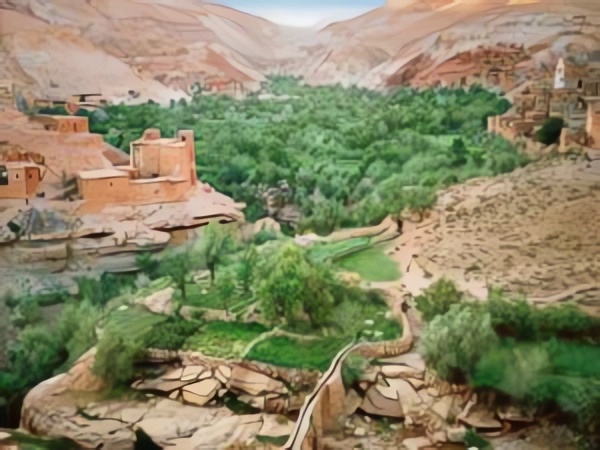 El alto Atlas marroquí es una zona áspera y salvaje habitada por los beréberes. Sus pueblos, con sus características casas de fango y techos planos, están diseminados por las laderas de las montañas mientras a sus pies crecen cultivos de nueces, melocotones y maíz. Toda el área está atravesada por caminos, algunos de los cuales eran seguramente rutas de caravanas de comerciantes o de peregrinos que se desplazaban entre el Sahara y la planicie septentrional del País.